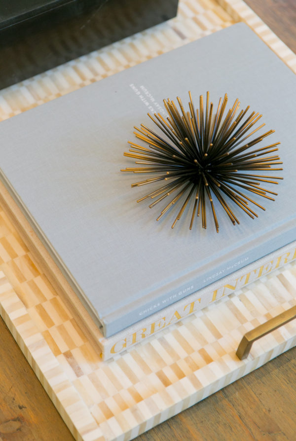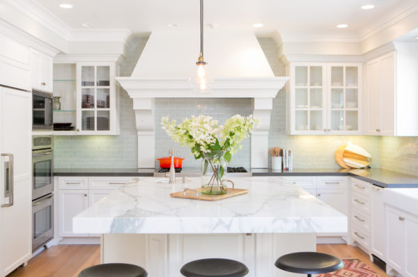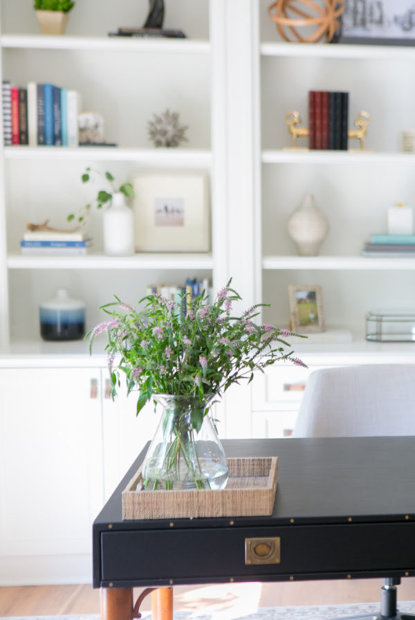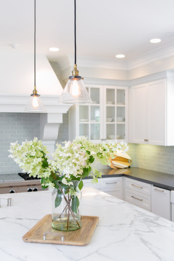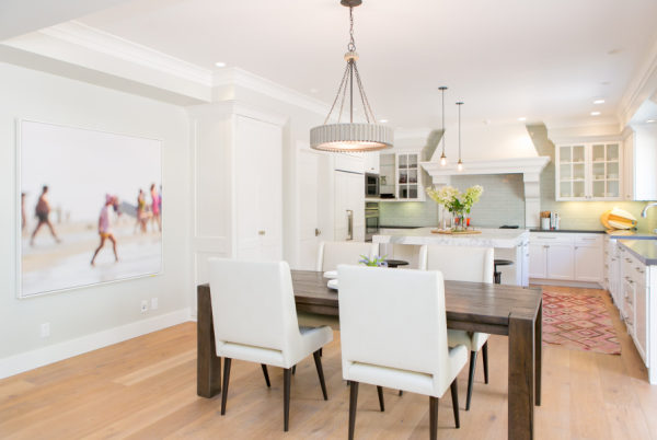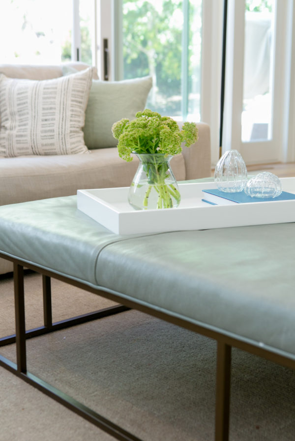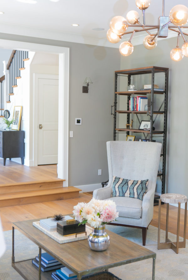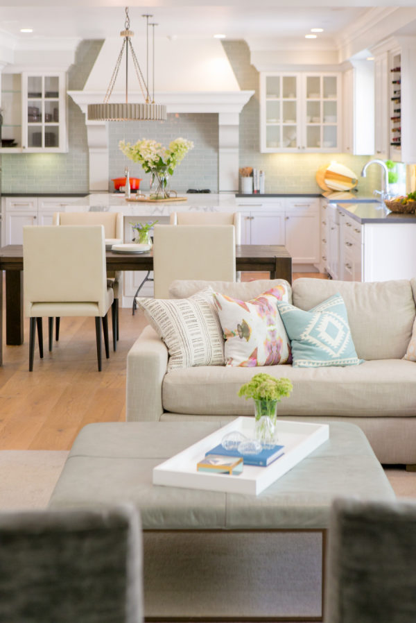 Backsplash: Walker Zanger | Design And Styling: Braun + Adams | Desk : Modern History Home | Entry Console: Noir | Entry Light, Dining Table And Sectional: Restoration Hardware | Family Room Sideboard: Weego Home | Grey Counters: Pental Quartz | Living Room Chairs: Hickory Chair | Living Room Coffee Table: Baker | Ottoman : MGBW | Paint: Benjamin Moore