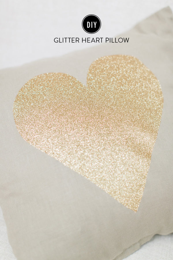 Center the glitter paper heart on the pillow case. Cover the paper with a dishtowel and iron the paper onto the cloth (making sure steam heat is turned off on the iron). Let cool slightly, then gently peel off the clear backing. Stuff with pillow insert and enjoy your new holiday pillow!