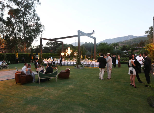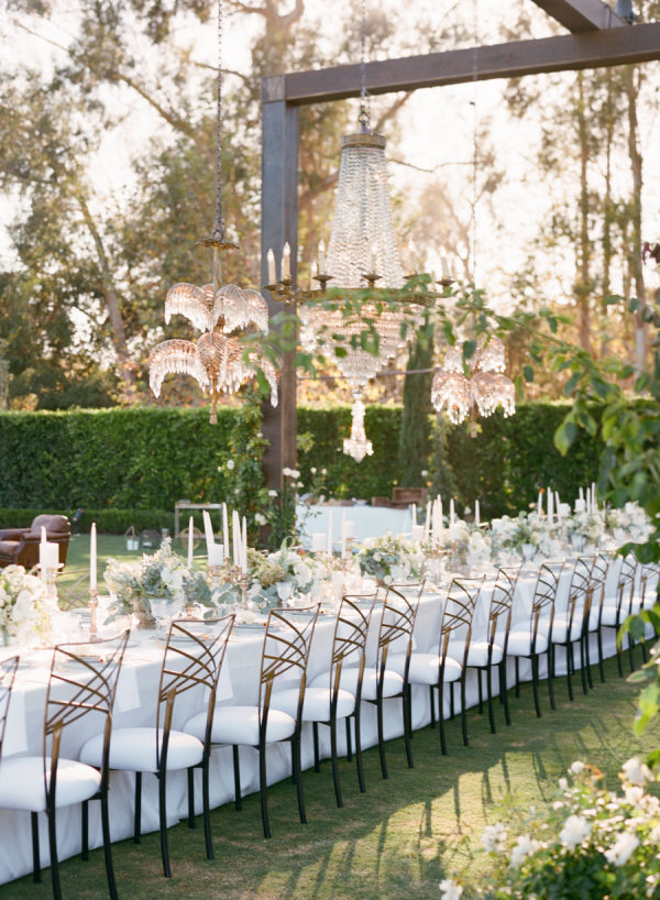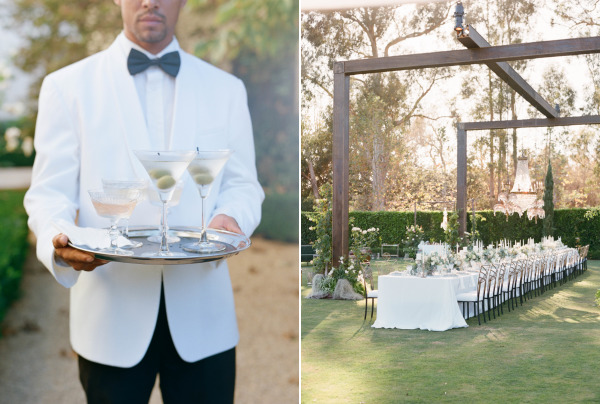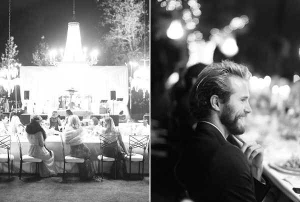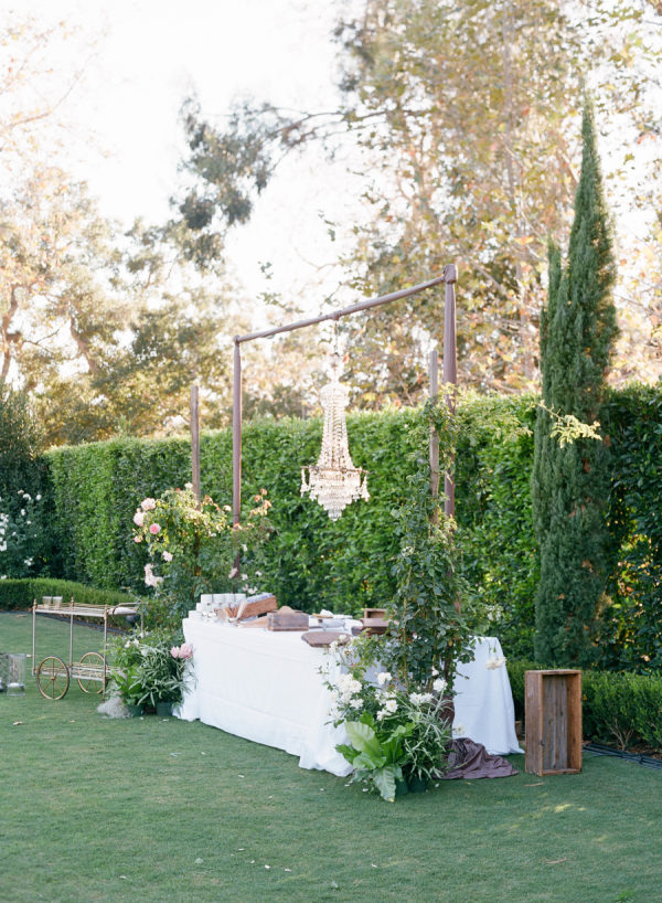 Large-scale vintage chandeliers were hung in trees on the property, over the vintage bars from Barn Relic and of course, over the dining table on which was served an incredible dinner from Heirloom LA. Candles and flowers from Flowerwild graced all surfaces, a custom covered dance floor brought in from Bella Vista Designs echoed the time period and welcomed guests to dance to the sounds of West Coast Music’s custom created band. For those not dancing, lounge furniture from Found, was the perfect escape.